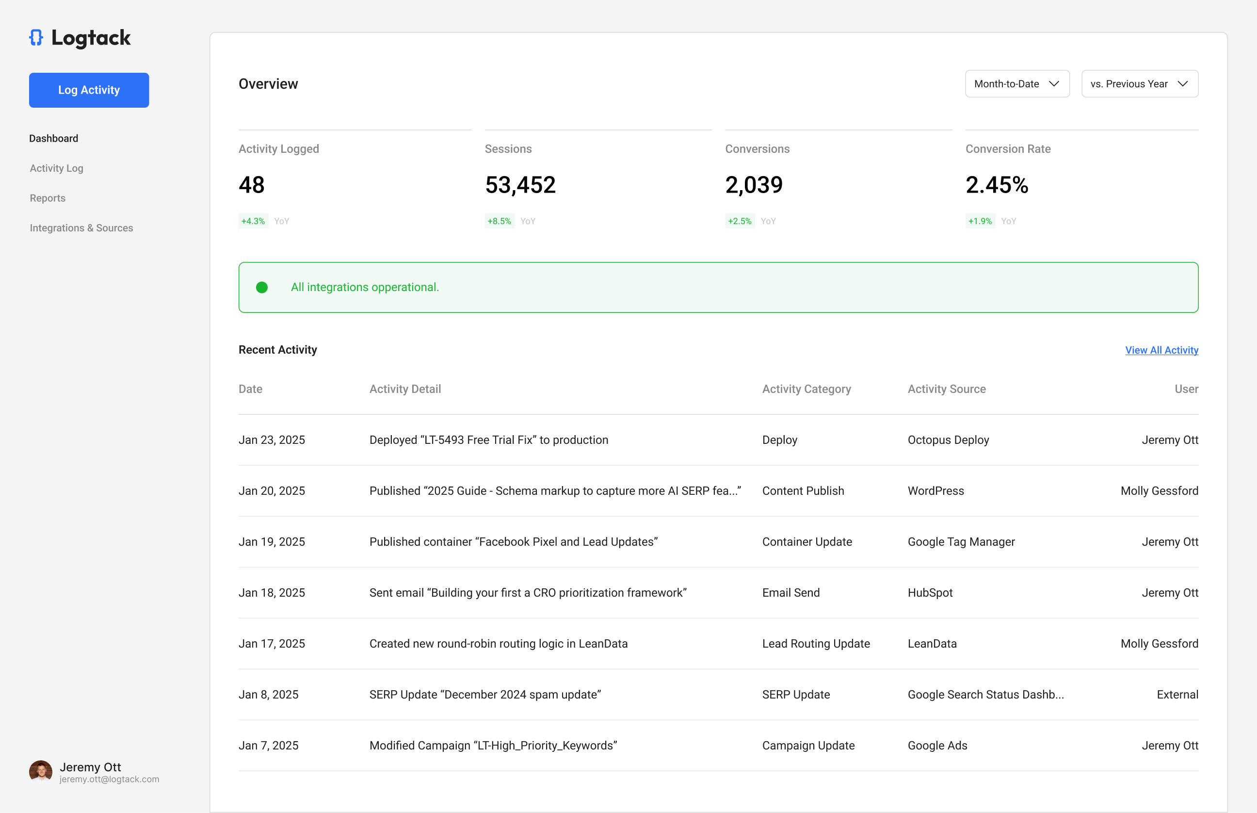 Logtack's centralized dashboard consolidates activity logs from all your marketing tools, providing a comprehensive view of every change made.
